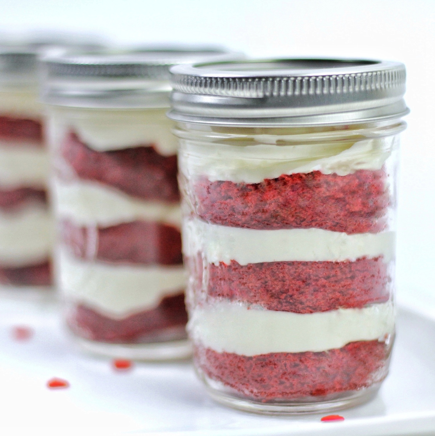 Moist layers of our famous red velvet cake with creamy layers of cream cheese filling topped with heart shaped sprinkles
